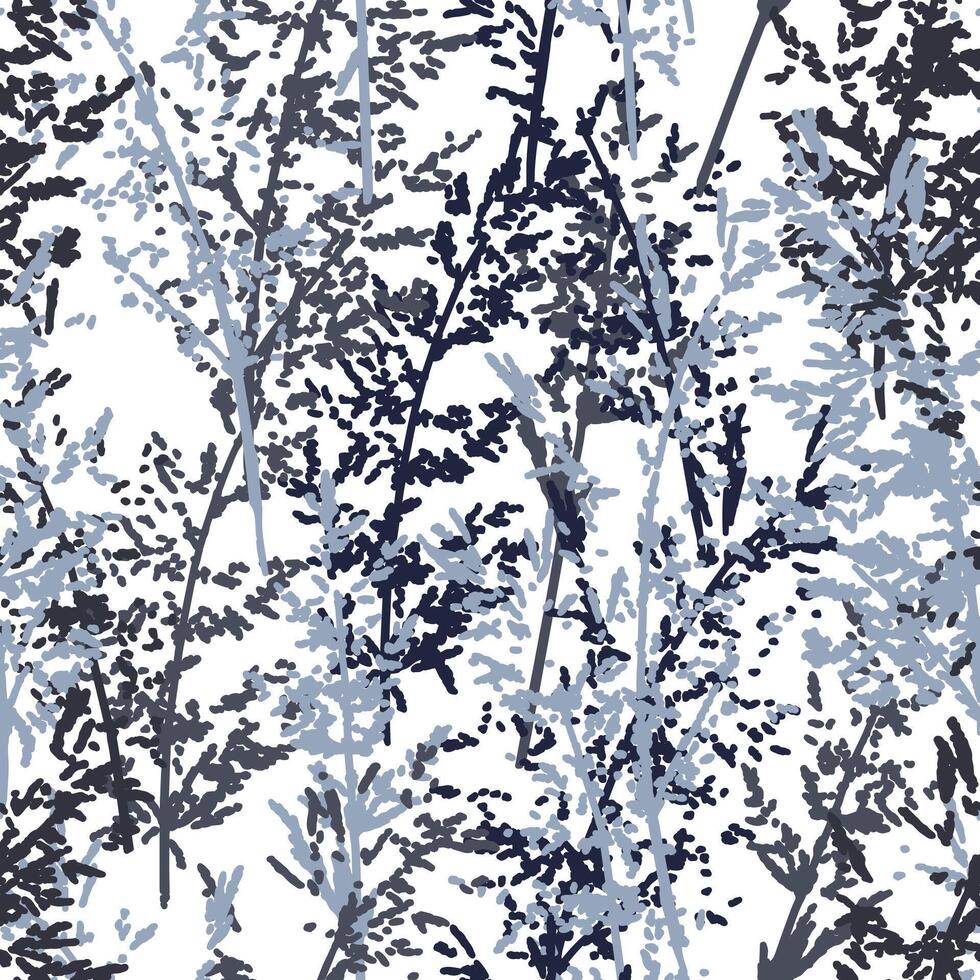 Seamless pattern featuring dense abstract botanical stems in cool blue and charcoal tones on a white background, creating a crisp, modern and nature inspired decorative design Pro Vector