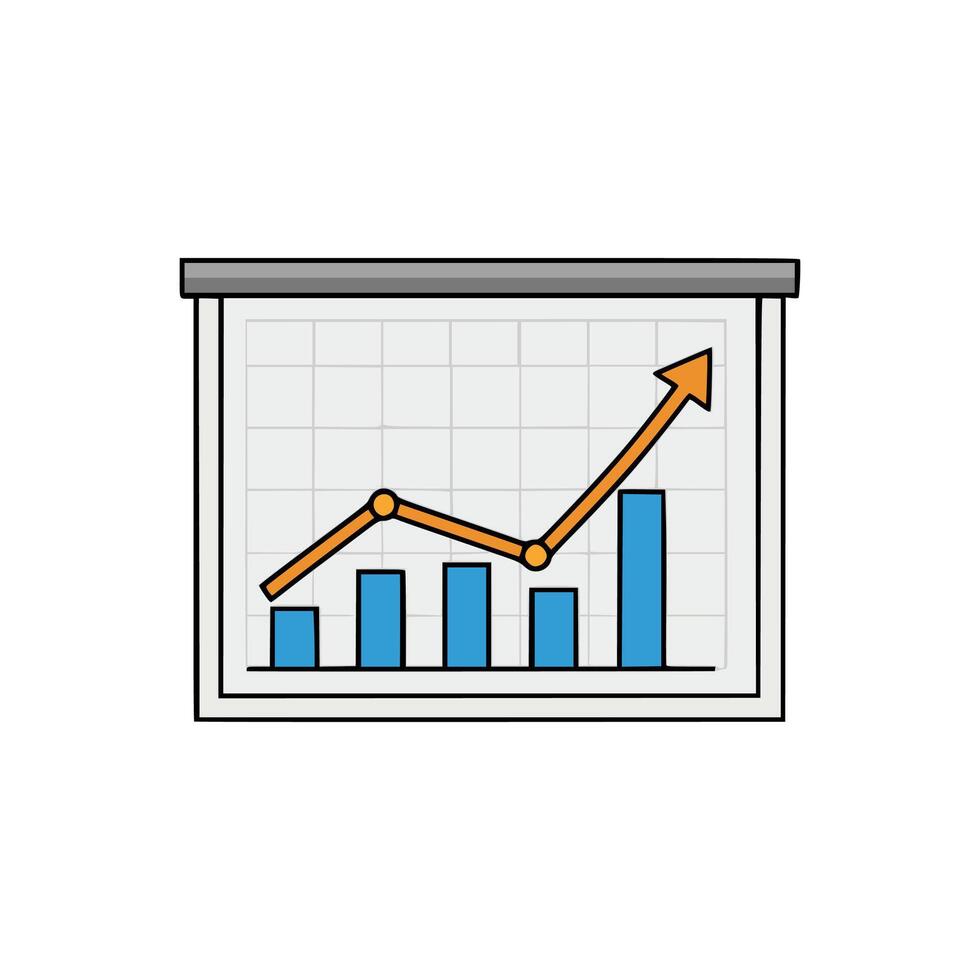Economic progress chart with rising orange arrow and blue columns on clean background, business data visualization concept Pro Vector