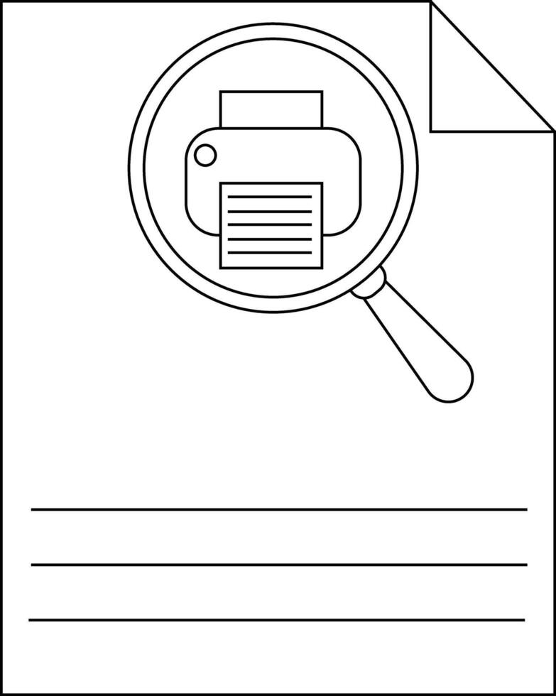 Outline image of a document with a magnifying glass over a printer icon and three lines for writing Pro Vector
