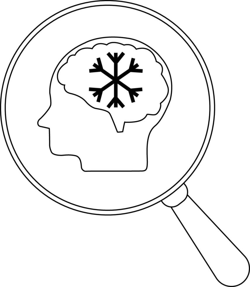 A brain silhouette with a snowflake inside viewed under a magnifying glass Pro Vector