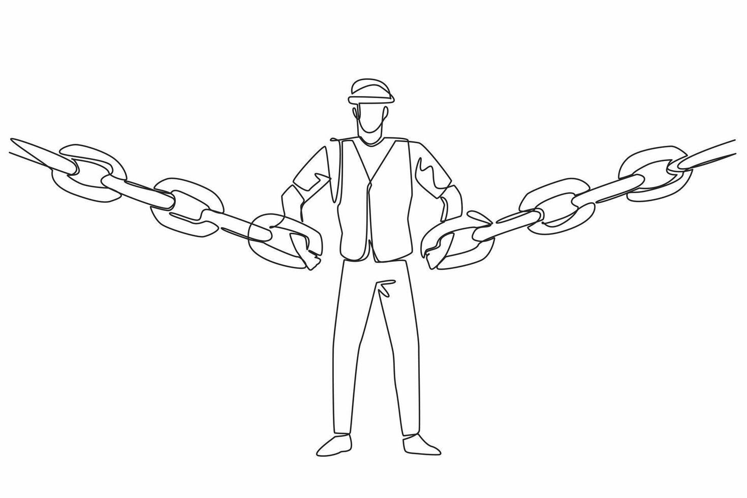 Single continuous line drawing man wearing project vest and helmet hooking chain with both hands. Symbolism. Connecting logistics needs. National Supply Chain Day. One line design Pro Vector