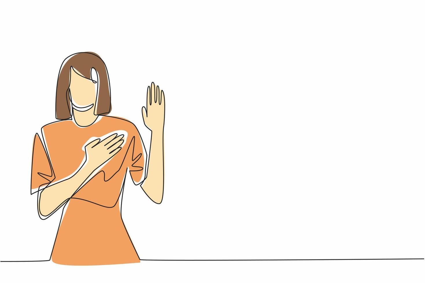 Continuous one line drawing woman in casual clothes posing oath gesture. Not looking for justification but indeed trustworthy. Sign. National Honesty Day. Single line draw design illustration Pro Vector