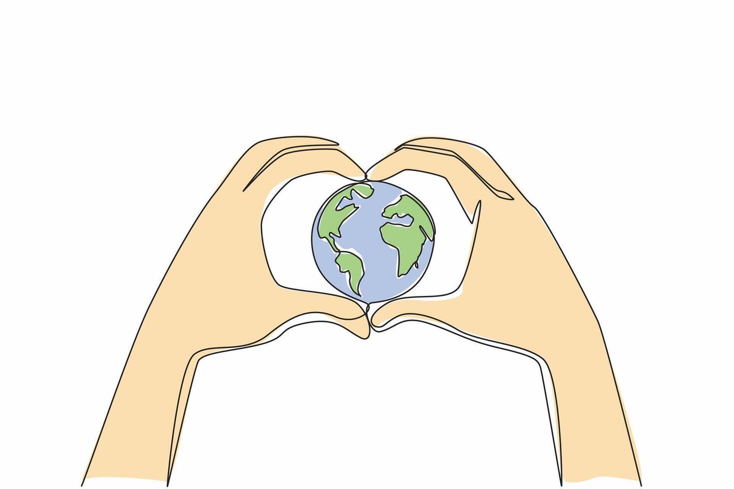 Continuous one line drawing 2 hands forming heart shape and in the middle of the hands is round globe. Protecting the earth with all love. Global Love Day. Single line draw design illustration Pro Vector