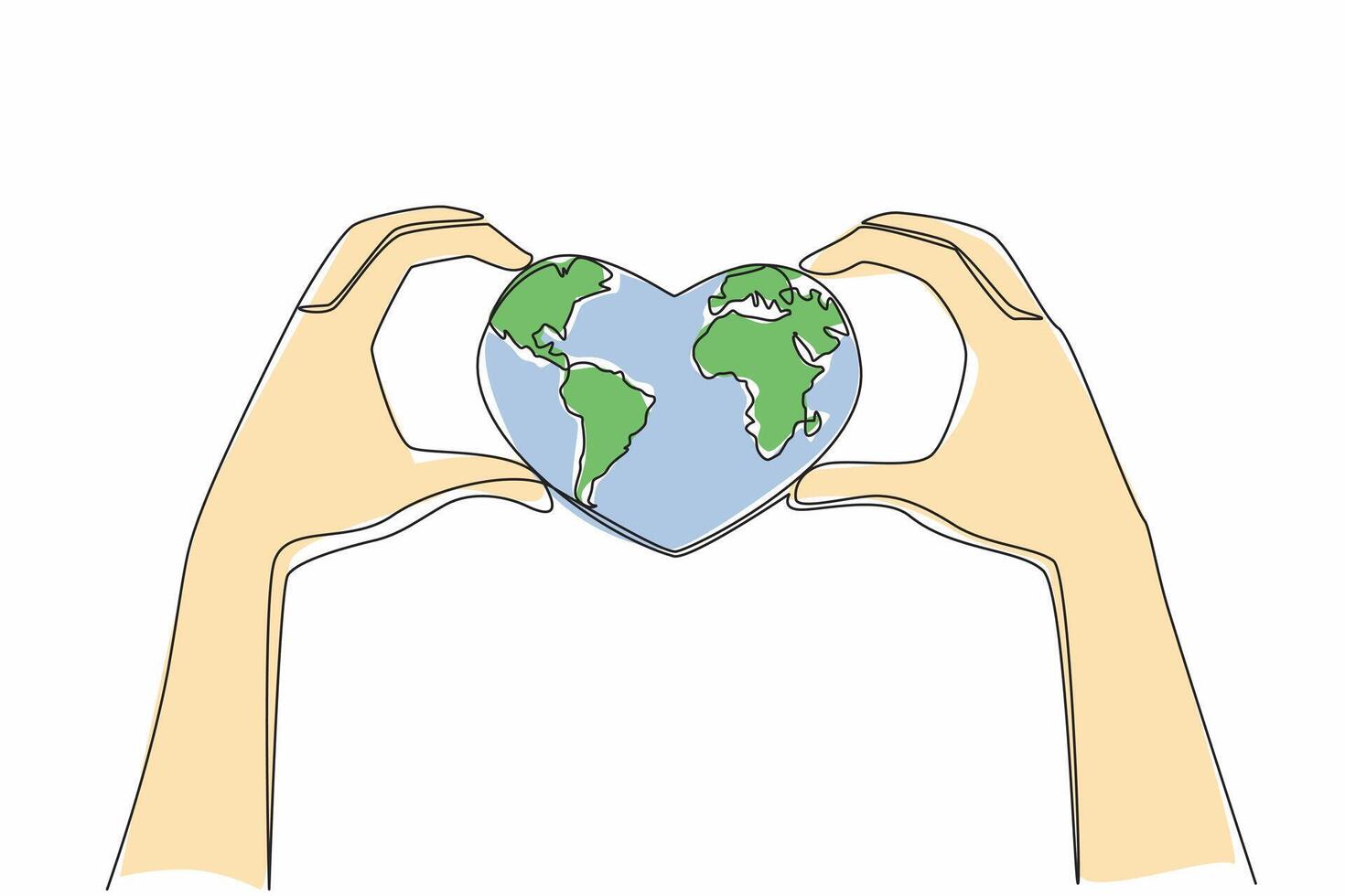 Single one line drawing 2 hands forming a heart shape and in the middle of the hands is a heart shaped globe. Loving treatment. Commitment. Global Love Day. Continuous line design graphic illustration Pro Vector