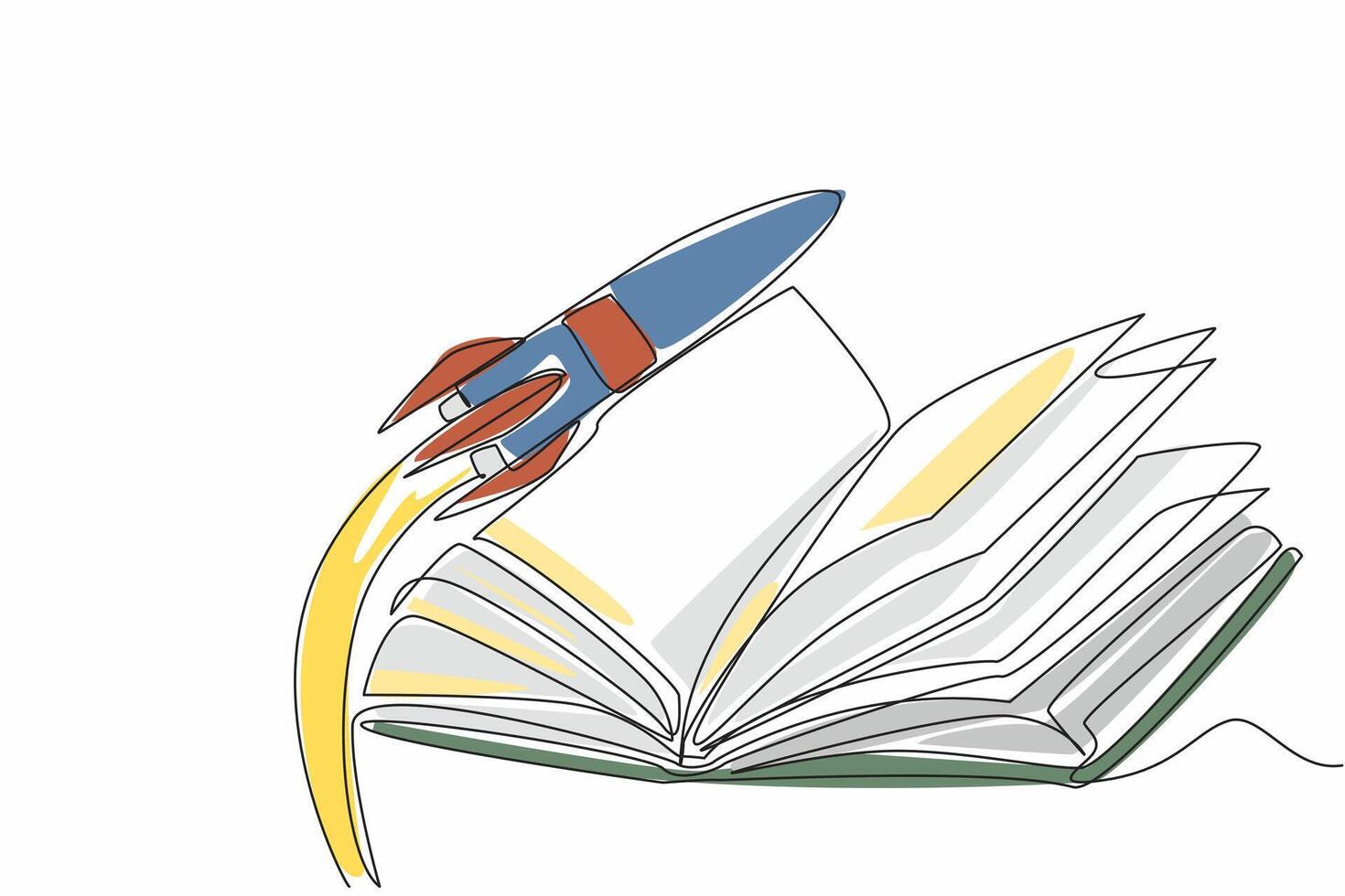Single continuous line drawing a rocket flying in the middle of an open thick book. Knowledge about the universe and its contents. Science. National Space Day. One line design illustration Pro Vector
