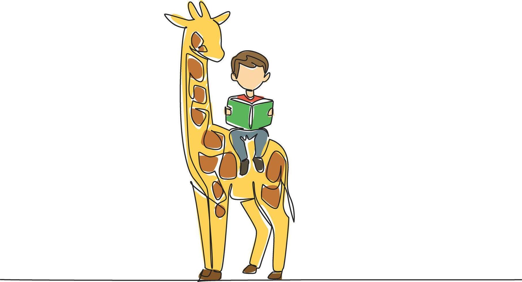 Continuous one line drawing the young boy reading book on cute giraffe. Learn about natural science directly from nature. Boy Reading Book at Animal Back. Single line draw design illustration Pro Vector