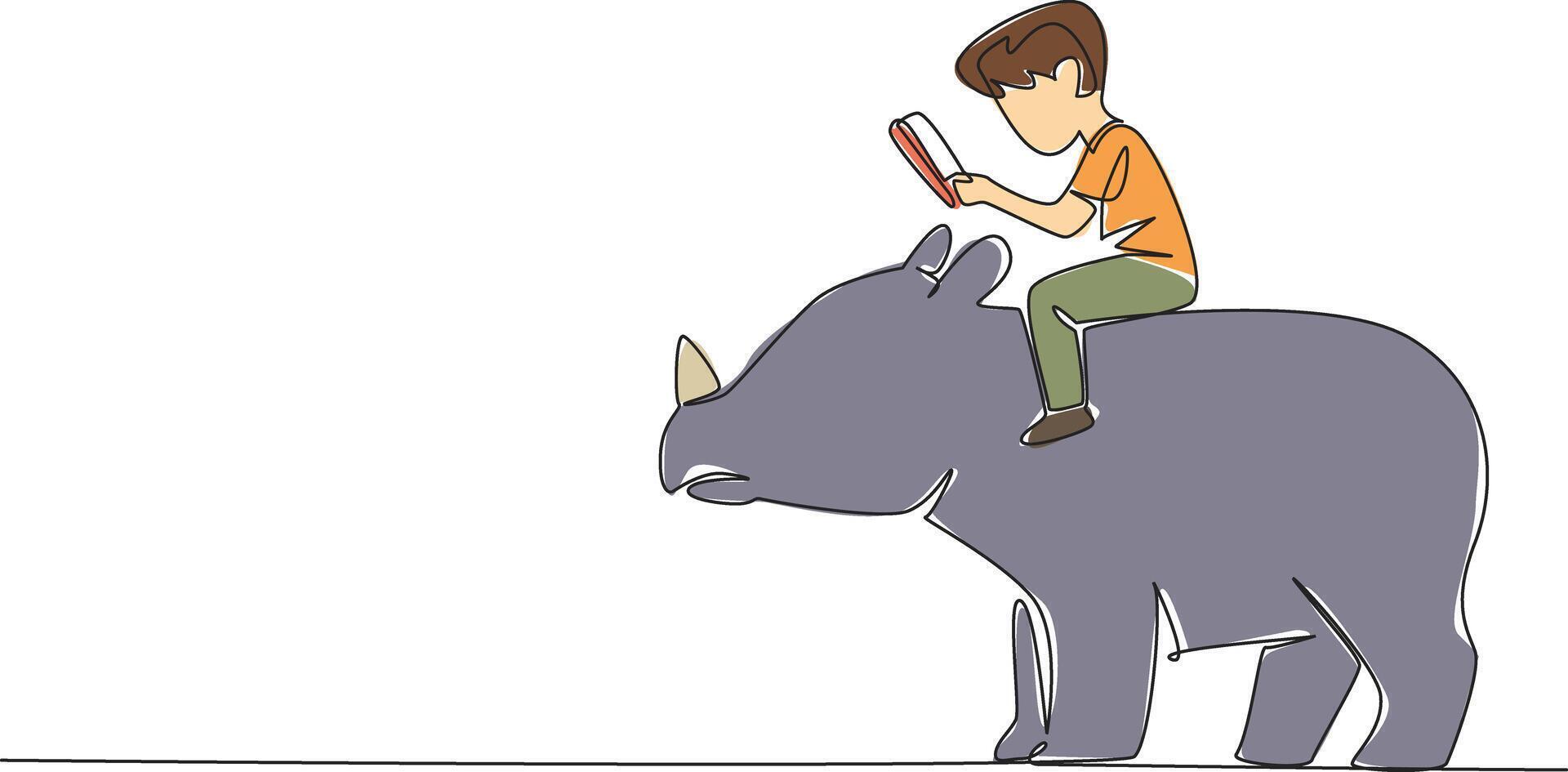 Continuous one line drawing boy reading book on cute rhinoceros. Read about one of the largest remaining megafauna. Nerd. Boy Reading Book at Animal Back. Single line draw design illustration Pro Vector