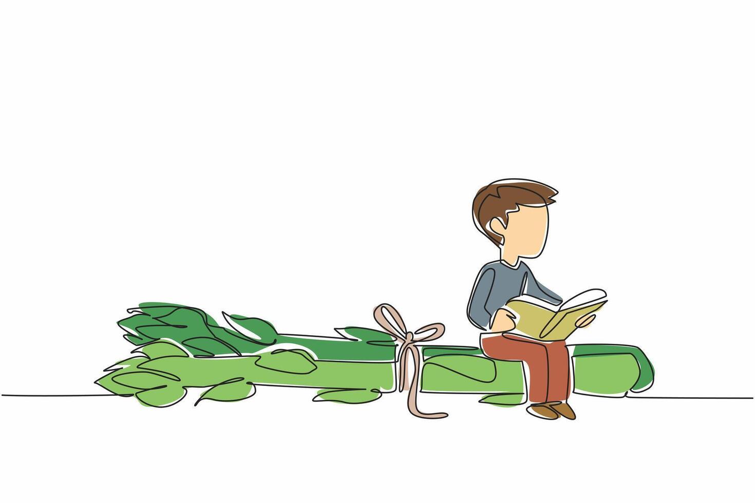 Single one line drawing boy reading on asparagus tied with string. Read antioxidant content found in asparagus. Boy Reading Book at Vegetables and Fruits. Continuous line design illustration Pro Vector