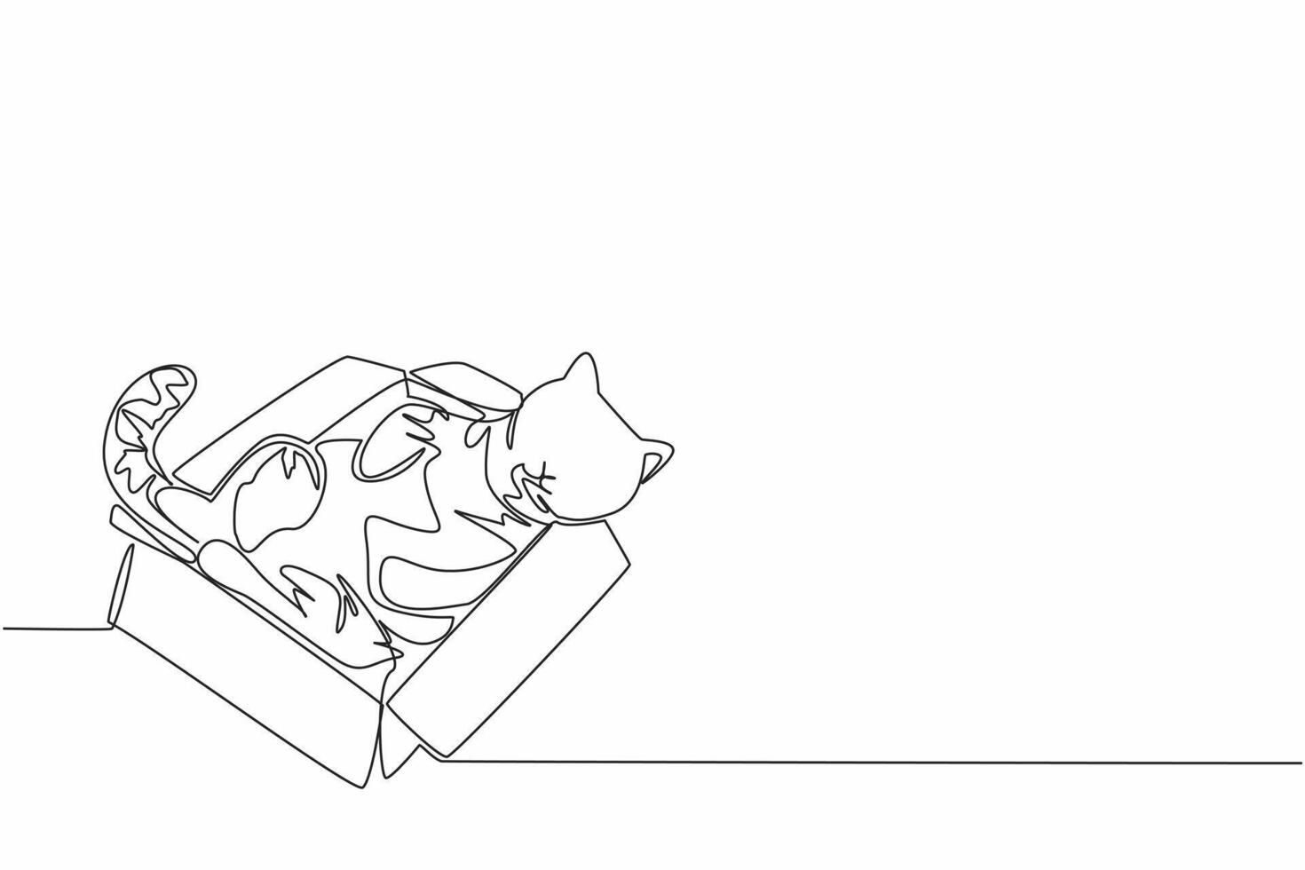 Single continuous line drawing tabby cat is sleeping in a cardboard box. Adorable behavior even when sleeping. Play and sleep place. Domestic. National Tabby Day. One line design Pro Vector