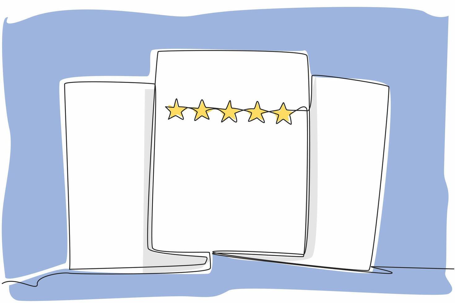 Single continuous line drawing 3 sheets of paper with the front sheet containing 5 stars. Evaluation review sheet. Better improvement. Feedback. Write a Review Day. One line illustration Pro Vector