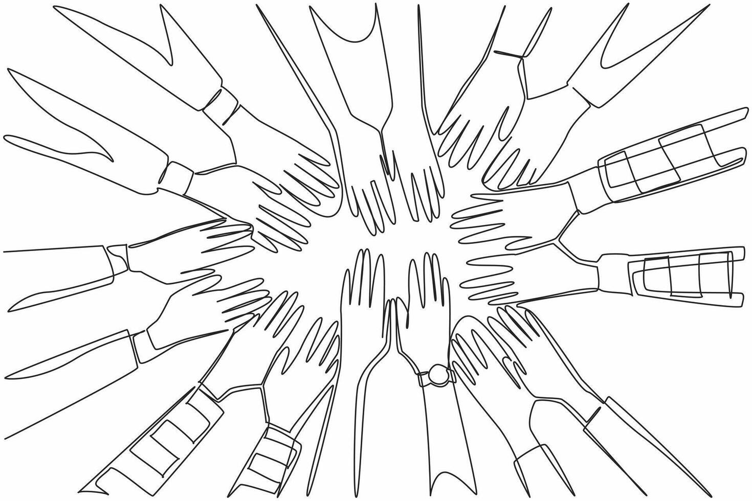Single continuous line drawing 8 pairs of hands with various sleeve models stacked on top of each other. Team agreement. Encouragement. Work group. Join Hands Day. One line draw illustration Pro Vector