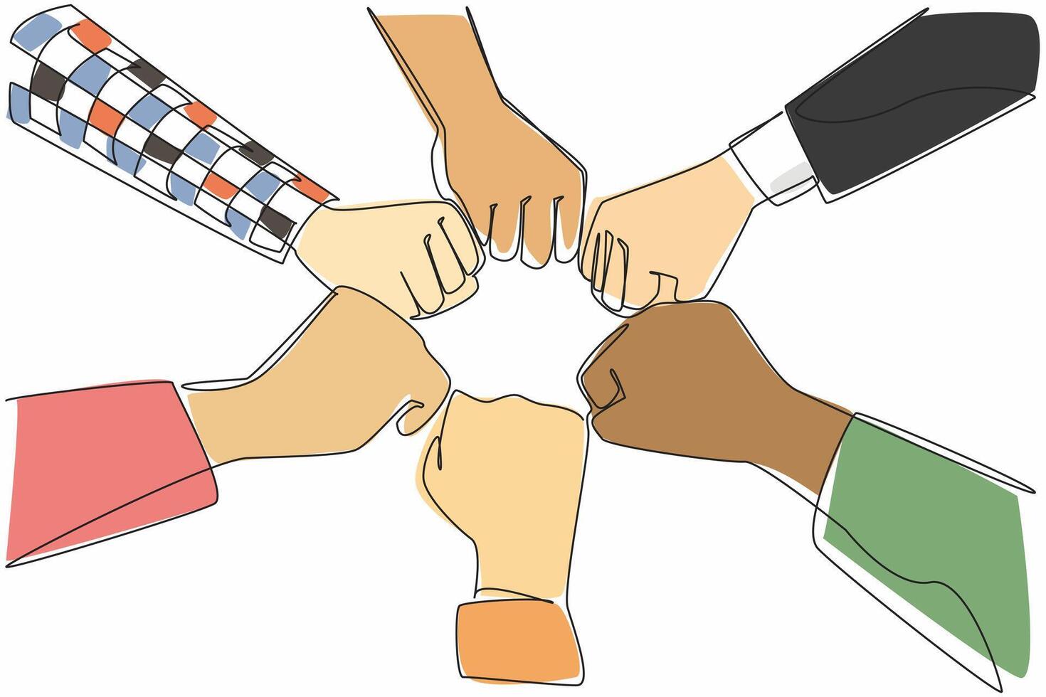 Single one line drawing 6 hands with different sleeve styles, clenching their fists together. Reaching consensus. Uniting spirit. Teamwork. Join Hands Day. Continuous line illustration Pro Vector