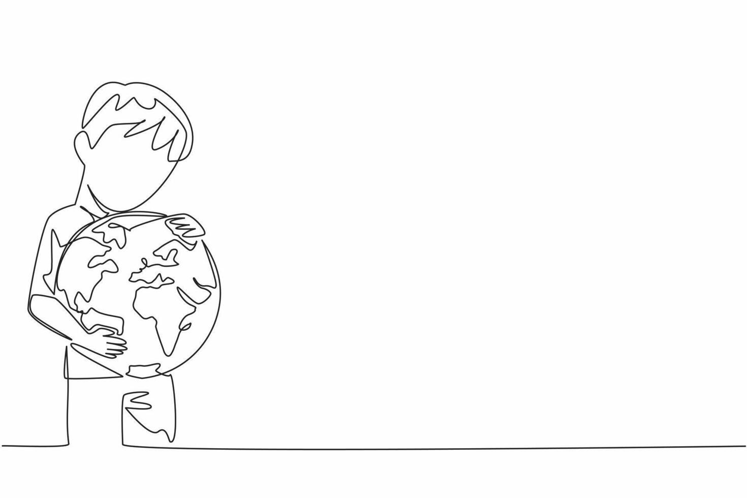 Single continuous line drawing the boy hugging globe. A symbol of keeping tightly. Not making air pollution. Protecting the earth from damage. Care. World Give Day. One line design illustration Pro Vector