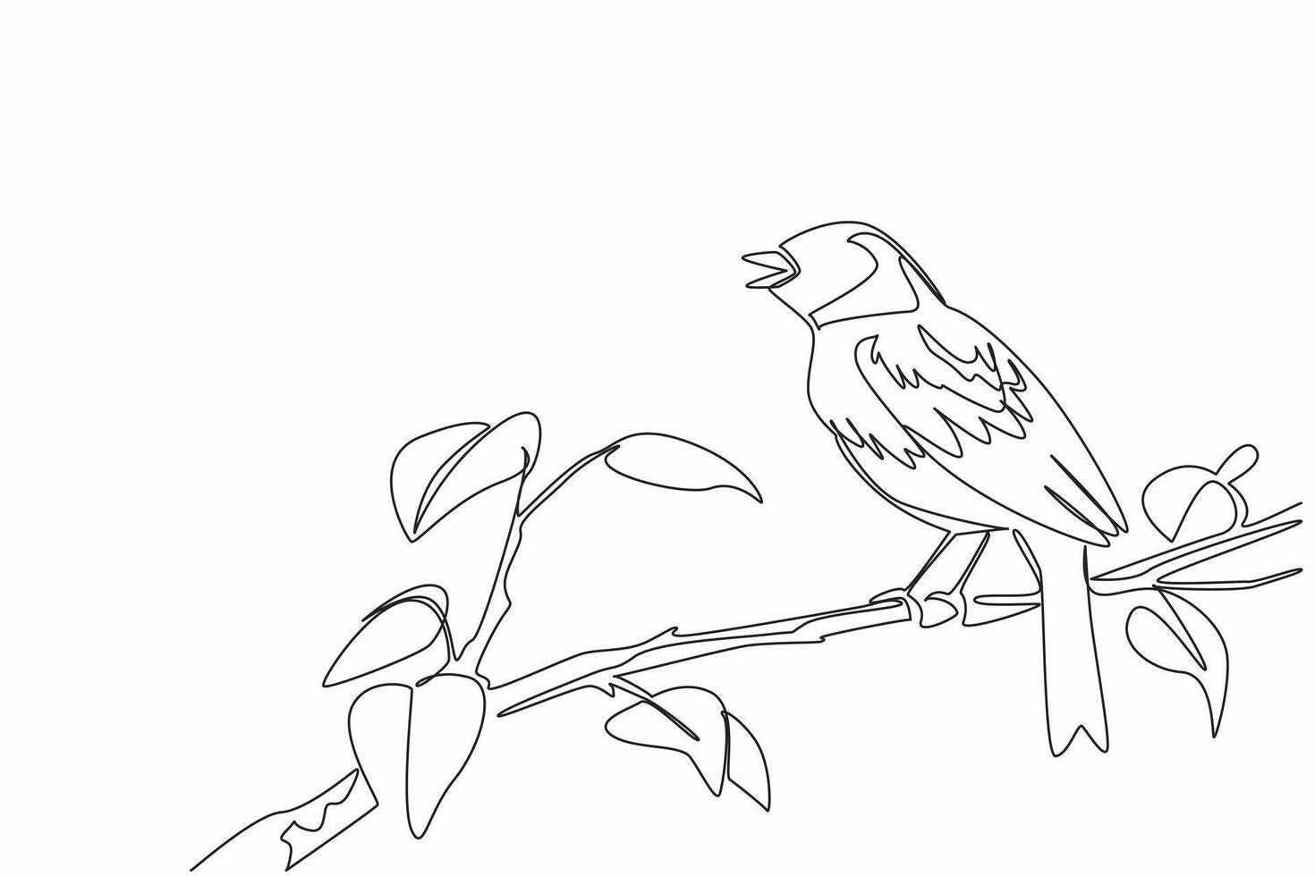 Continuous one line drawing dunnock bird perched on tree branch with leaves. Landed and chirped. The little one from Europe. International Dawn Chorus Day. Single line draw design Pro Vector