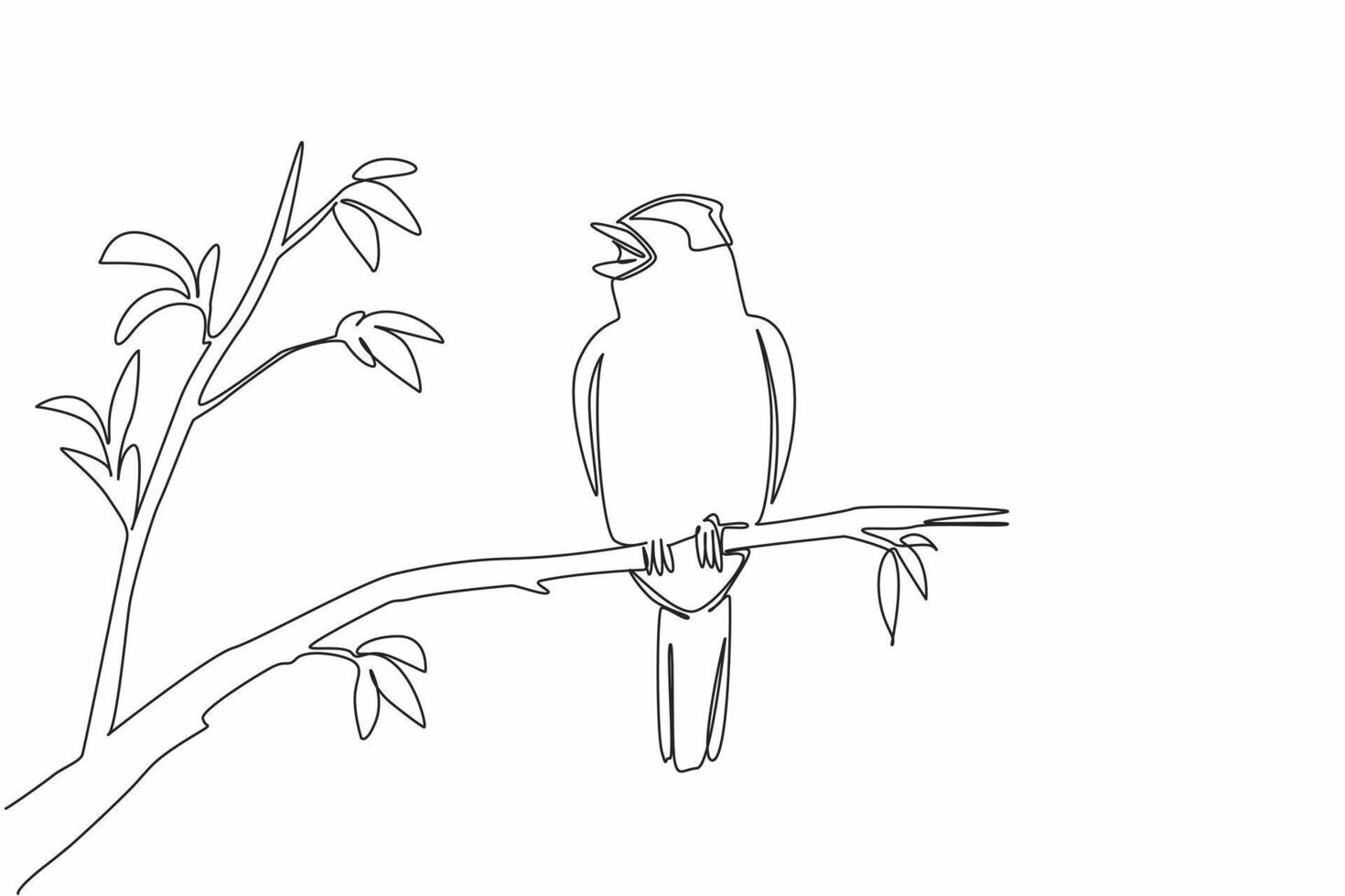 Continuous one line drawing blackcap bird perched on tree branch with leaves. Cold weather resistant birds. The songbird. International Dawn Chorus Day. Single line draw design Pro Vector