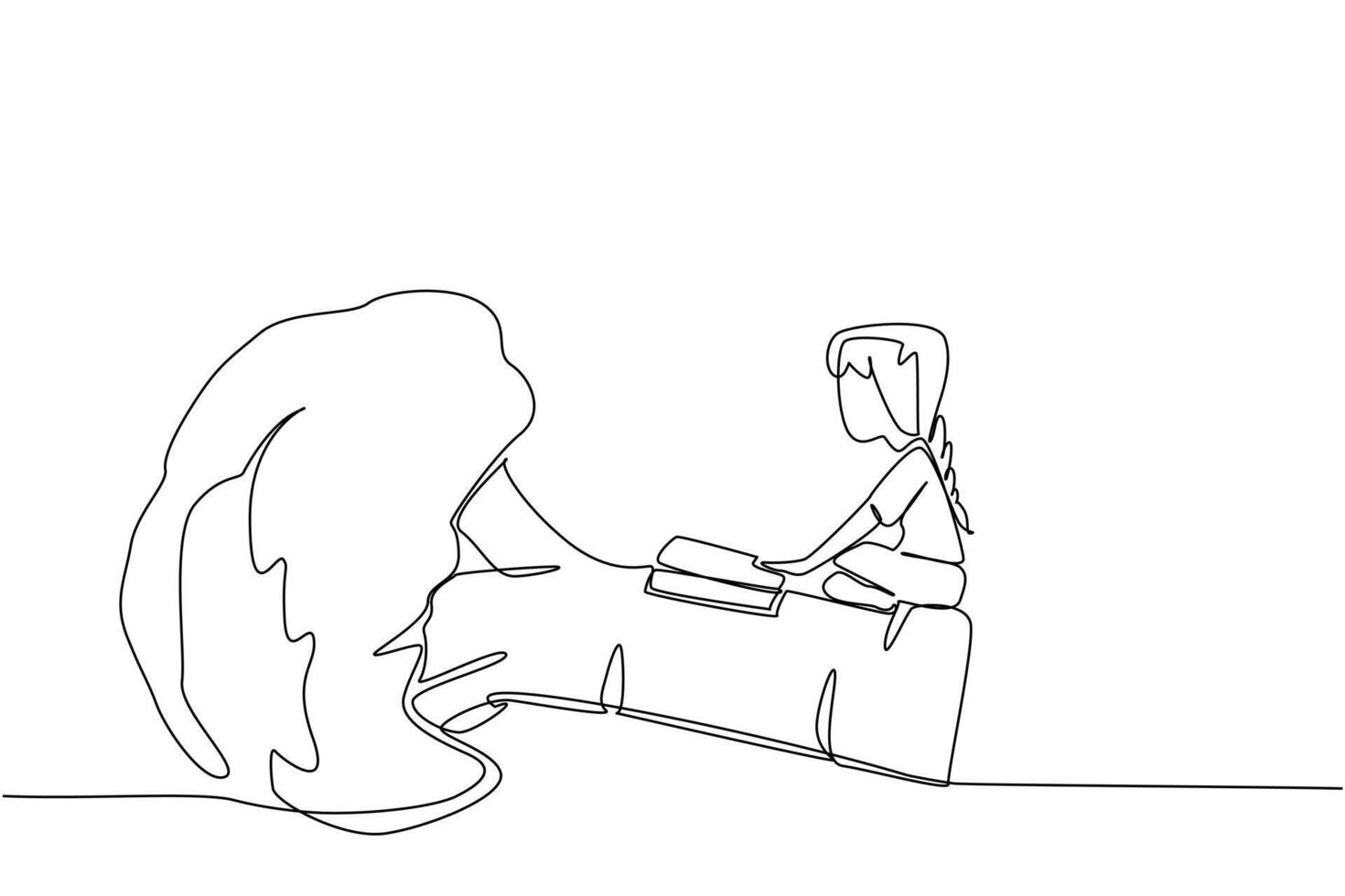 Single one line drawing girl reading on broccoli. Curiosity makes learning. Know a lot of knowledge. The nerd. Girl Reading Book at Vegetables and Fruits. Continuous line design graphic illustration Pro Vector