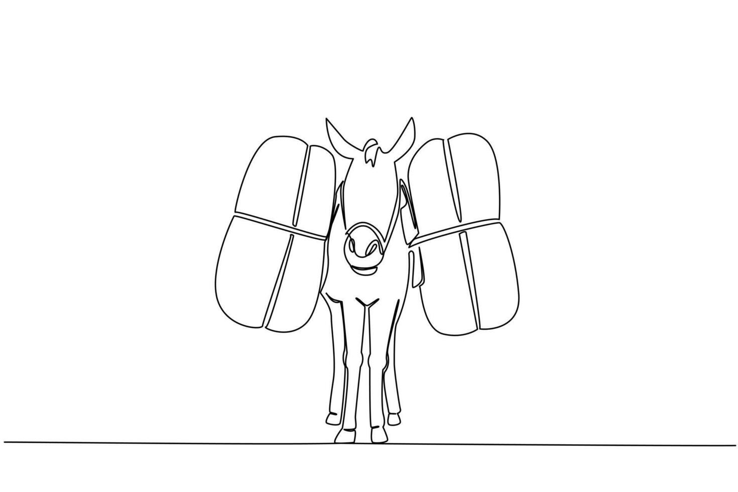 Single one line drawing donkey carrying stuff. Helping to carry stuff while climbing. Benefit for many people. Possible skills for hire. World Donkey Day. Continuous line design graphic illustration Pro Vector