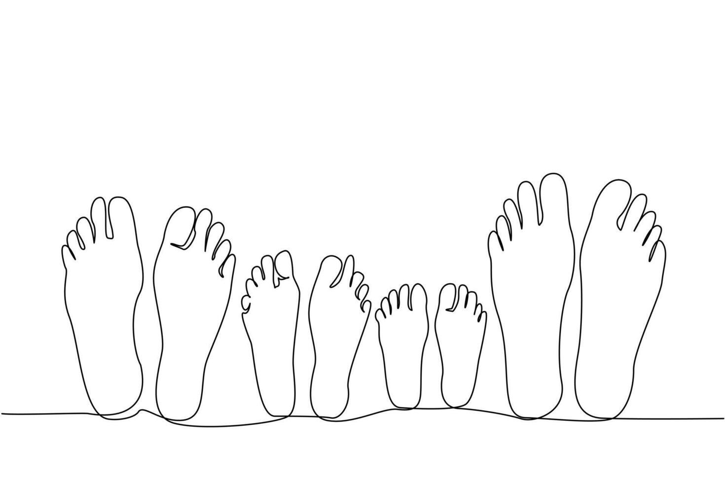 Single one line drawing 4 pairs of feet are lying down relaxing. A warm and harmonious family. Always make time to chat with each other. No Socks Day. Continuous line design graphic illustration Pro Vector