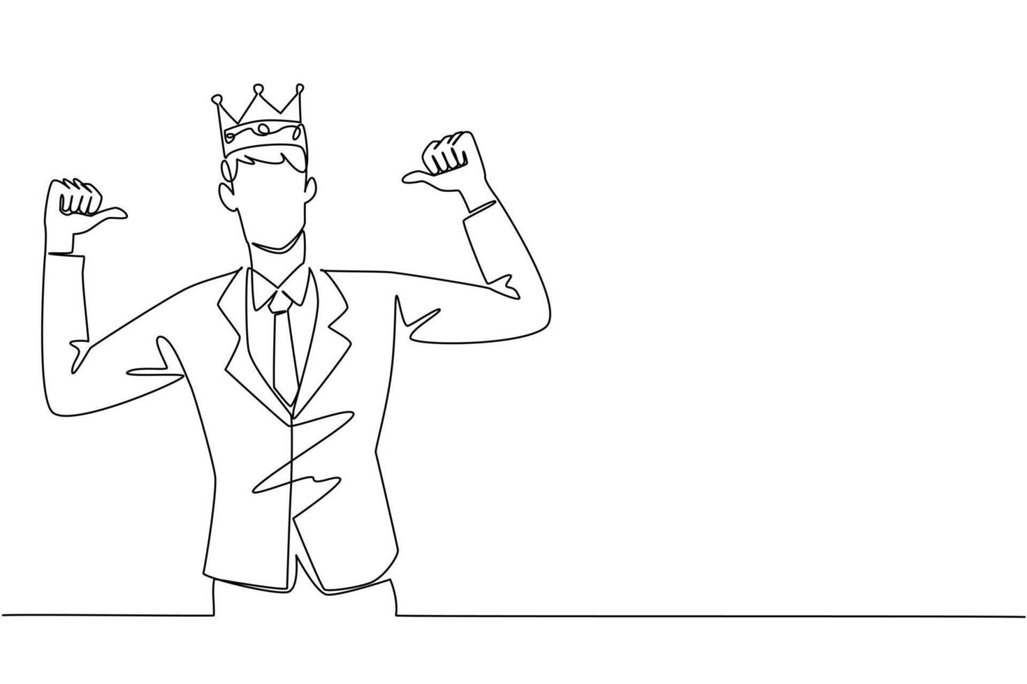 Continuous one line drawing a man in a suit and tie wearing a crown and pointing at himself with both thumbs up. Honorary title. Happy. Reward Yourself Day. Single line draw design illustration Pro Vector