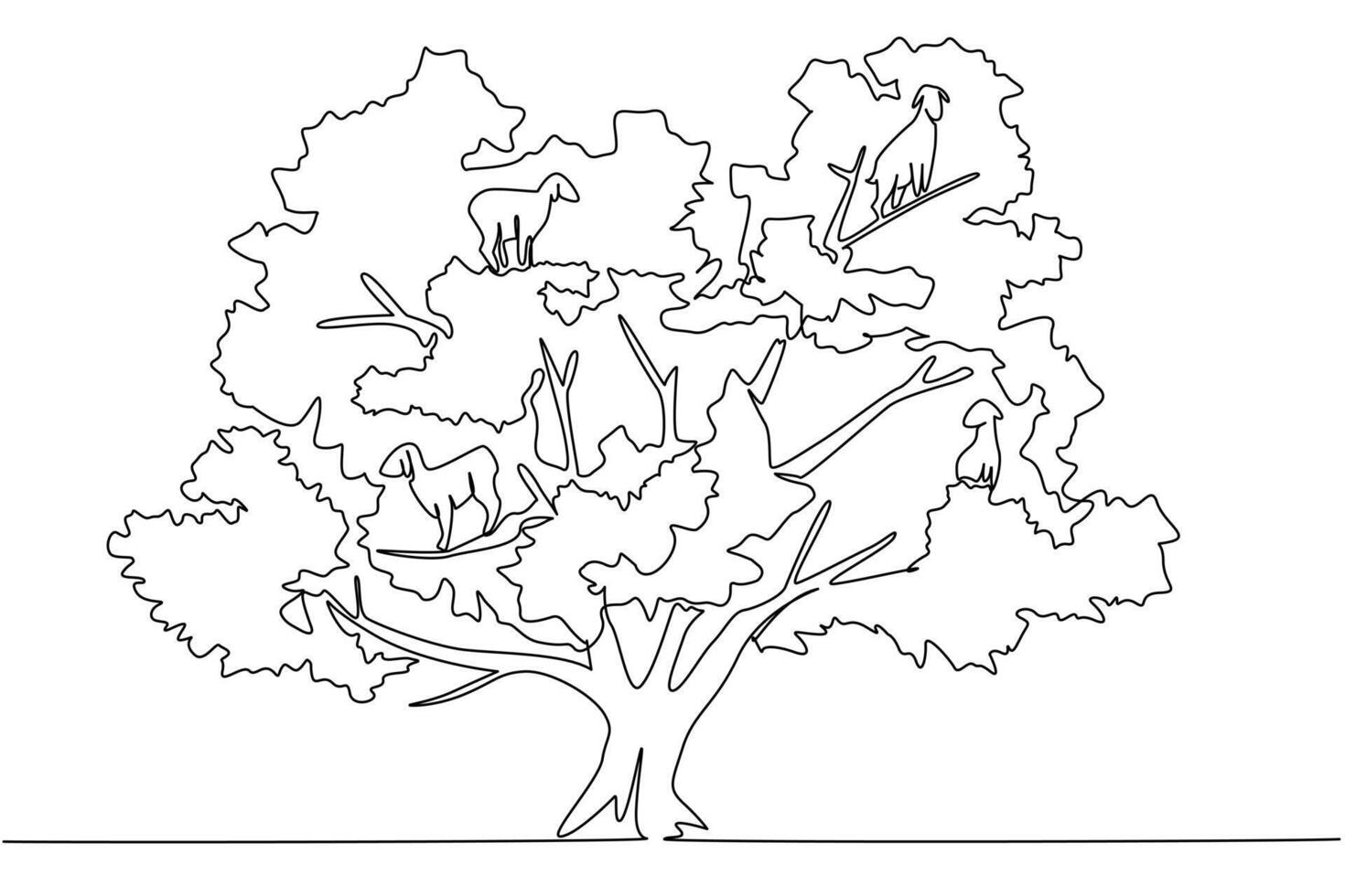 Continuous one line drawing an argania tree with several goats climbing on it. Favorite season for climbing argan trees. International Day of Argania. Single line draw design illustration Pro Vector