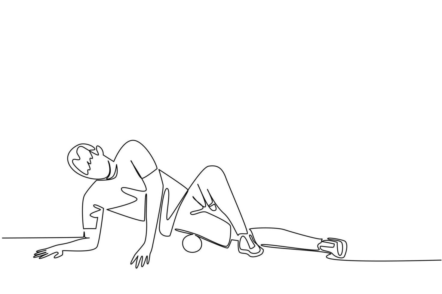 Continuous one line drawing a man exercising using a foam roller. Cooling with tools. Recovery after minor injuries. Treatment. National Foam Rolling Day. Single line draw design illustration Pro Vector