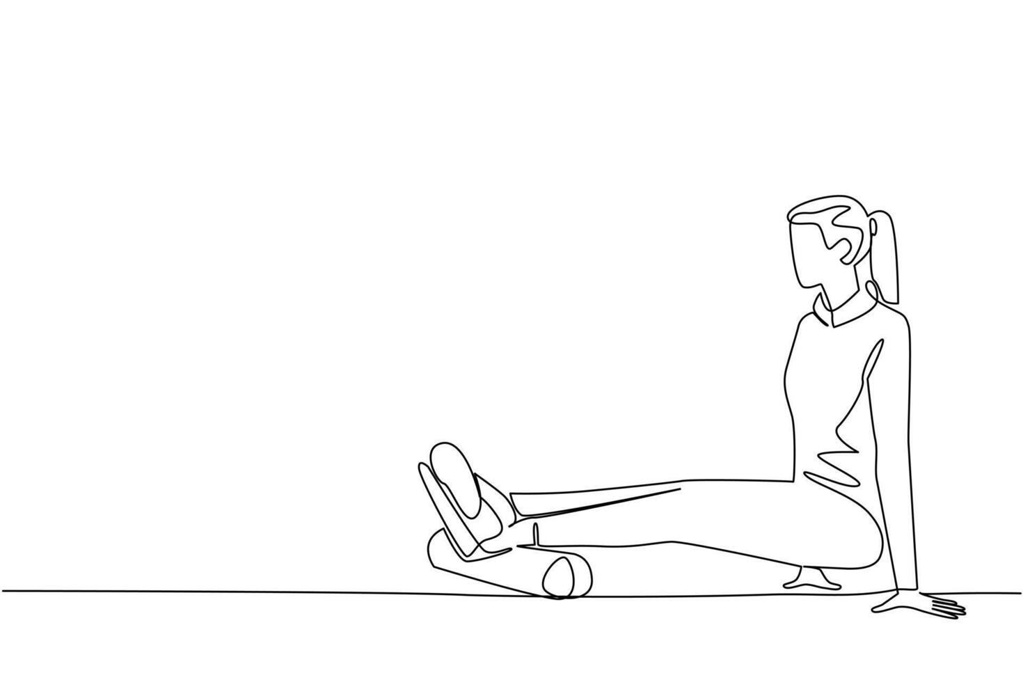Single continuous line drawing a woman exercising using a foam roller. Sprain. Minor ankle injury. Recovery. Restore joint strength. National Foam Rolling Day. One line design illustration Pro Vector