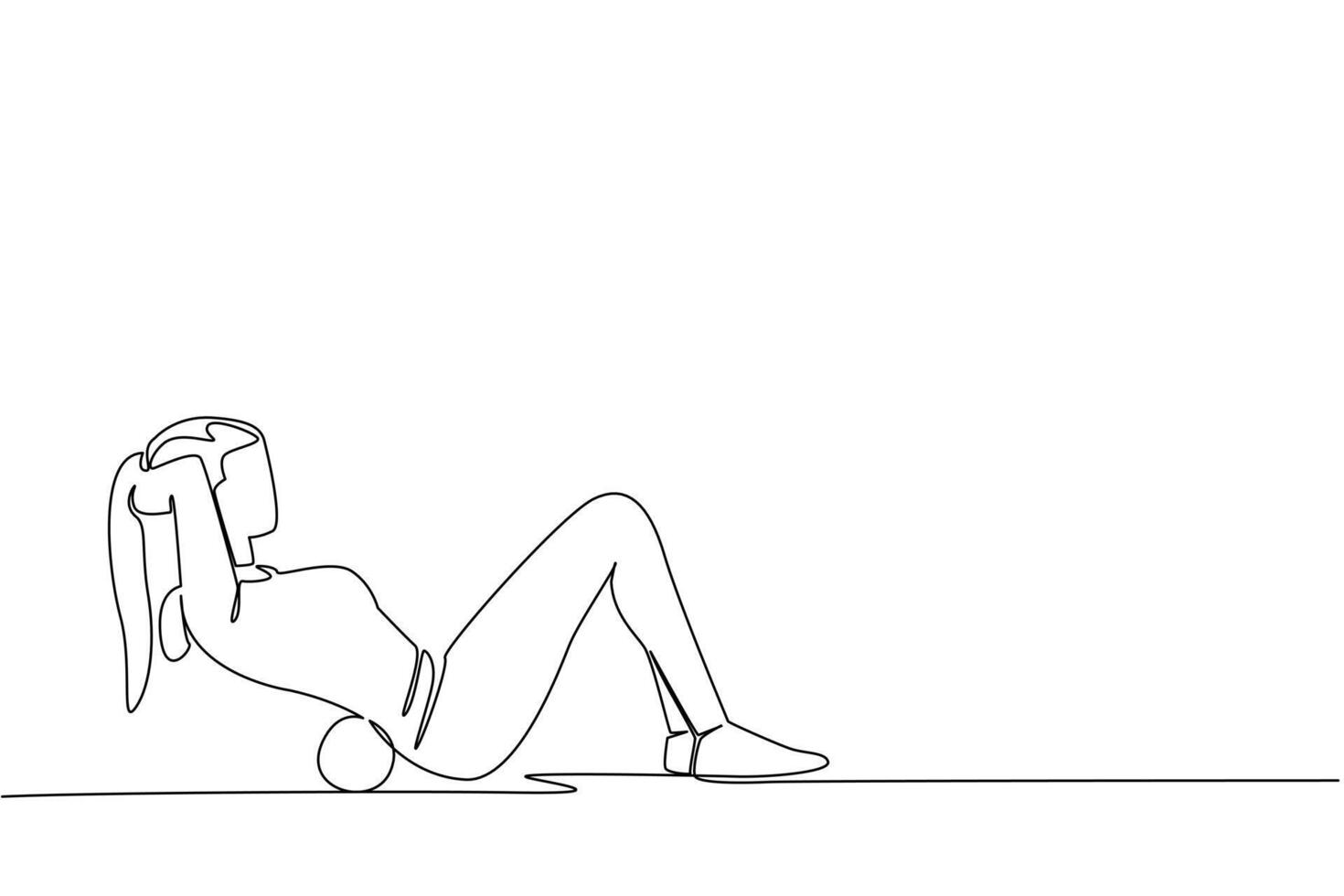 Single one line drawing a woman exercising using a foam roller in sit up pose. Relaxing the hips. A little therapy to calm down. National Foam Rolling Day. Continuous line design graphic illustration Pro Vector