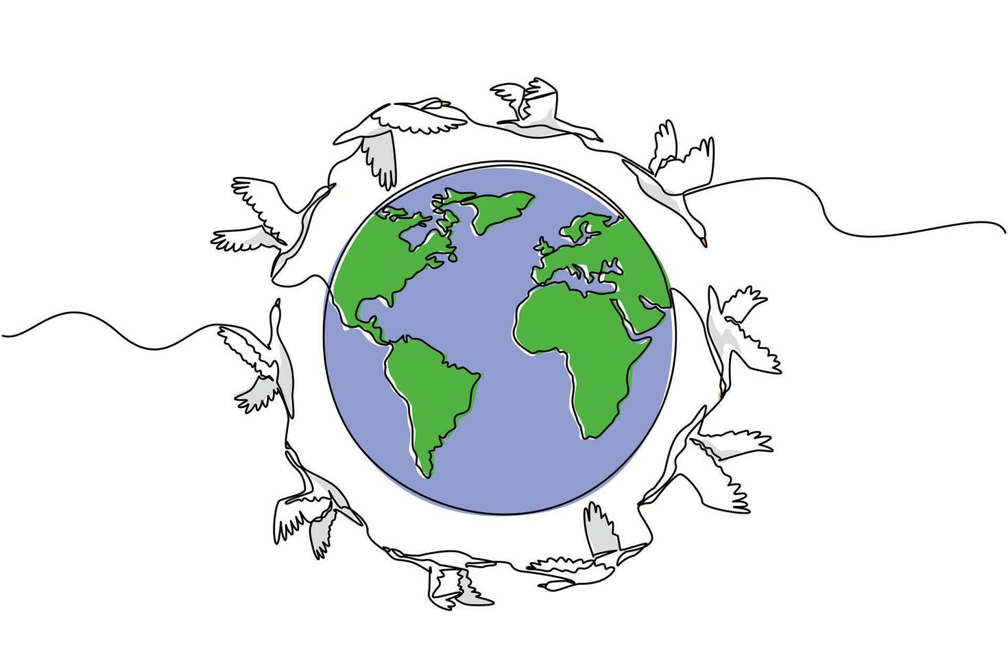Single one line drawing goose flies mass around globe full. Go in groups to avoid predatory birds. Avoiding summer in the south. World Migratory Bird Day. Continuous line design illustration Pro Vector