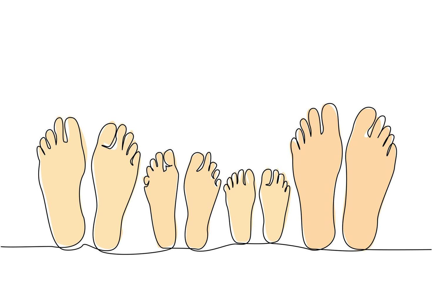 Single one line drawing 4 pairs of feet are lying down relaxing. A warm and harmonious family. Always make time to chat with each other. No Socks Day. Continuous line design illustration Pro Vector