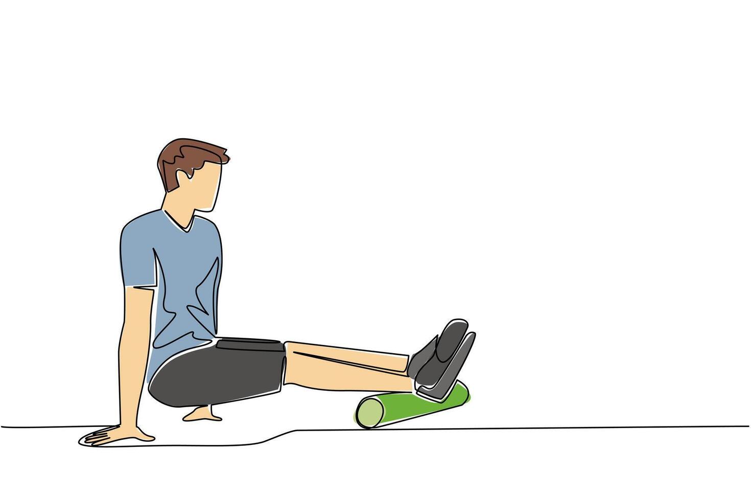 Single one line drawing a man exercising using a foam roller. Handling of minor injuries. Highly competent medical team. Gym. National Foam Rolling Day. Continuous line design illustration Pro Vector