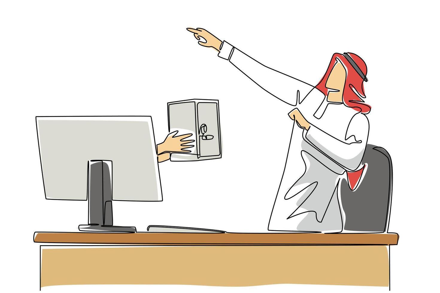 Single continuous line drawing hands out of the monitor screen while holding a safe deposit box. Happiness to secure data. Safe. Anti theft. Things from Screen. One line design illustration Pro Vector