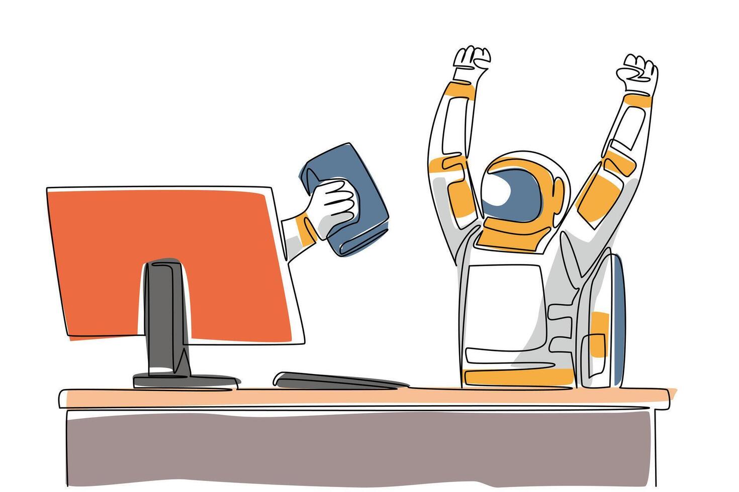 Single one line drawing hand of astronaut out of monitor screen while holding a thick book. Adventure book. Survival in space. Bookworm. Things from Screen. Continuous line design graphic illustration Pro Vector