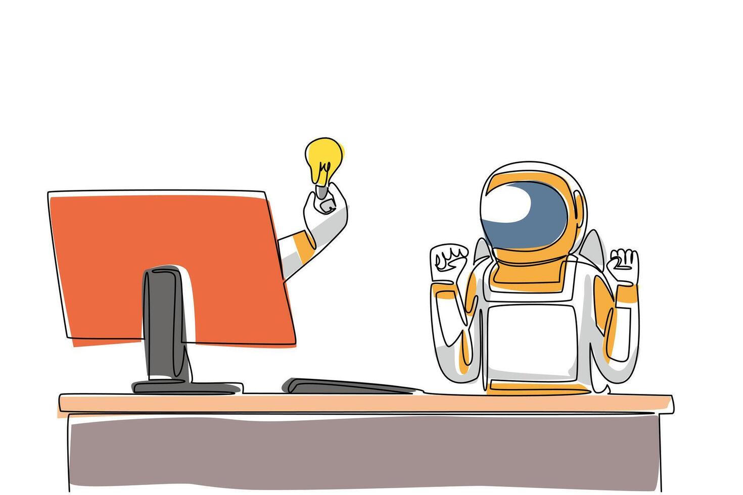 Continuous one line drawing hand of astronaut out of monitor screen while holding a bulb lamp. Get brilliant ideas about expeditions. Things from Screen. Single line draw design illustration Pro Vector
