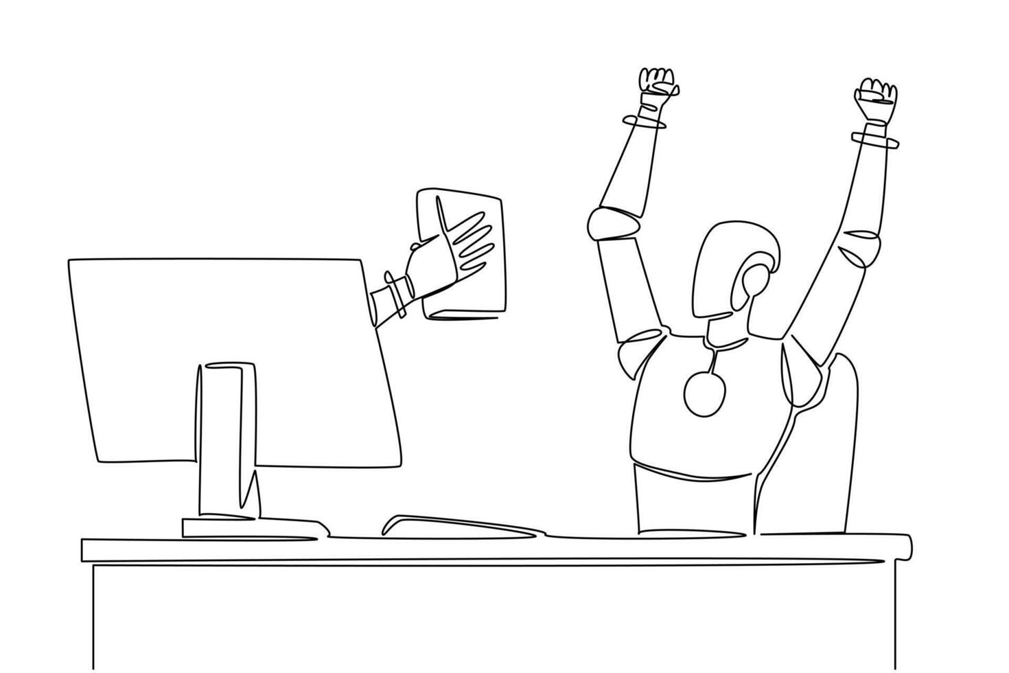 Continuous one line drawing hand of robot out of monitor screen while . holding thick book. Manual guidance enables intelligence. Tech. Things from Screen. Single line draw illustration Pro Vector