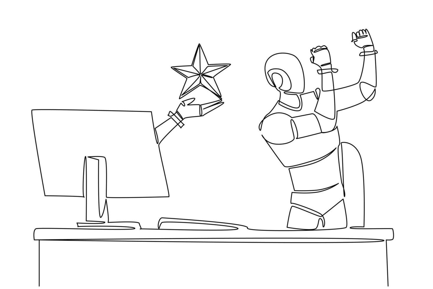 Single one line drawing hand of robot out of monitor screen while holding a star shape. Programmed to always give the best. High tech. Things from Screen. Continuous line design illustration Pro Vector