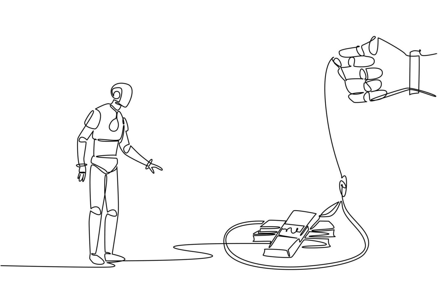 Continuous one line drawing robot walking towards a rope trap containing several stacks of banknotes. Barriers to a sophisticated future. Trap. Money Bait. Single line draw illustration Pro Vector