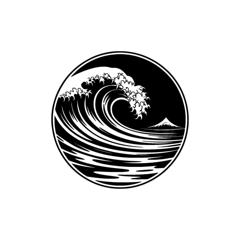 A minimalist illustration of a powerful crashing wave in a circular frame with Mount Fuji visible in the distance under a dark sky Pro Vector