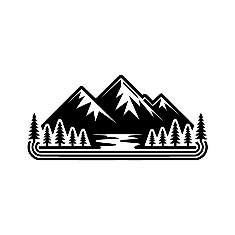 A striking silhouette of a majestic mountain range with snow capped peaks flowing into a serene river surrounded by a line of pine trees and a decorative border Pro Vector