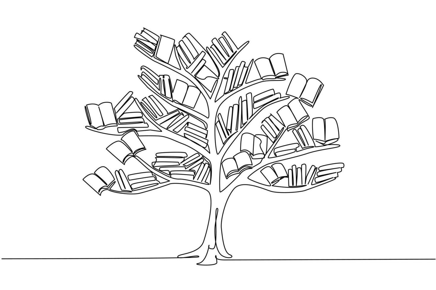 Single one line drawing a tree with branches filled with various books. The higher the level, the more knowledge is needed. Artificial plants. Book Tree. Continuous line design illustration Pro Vector
