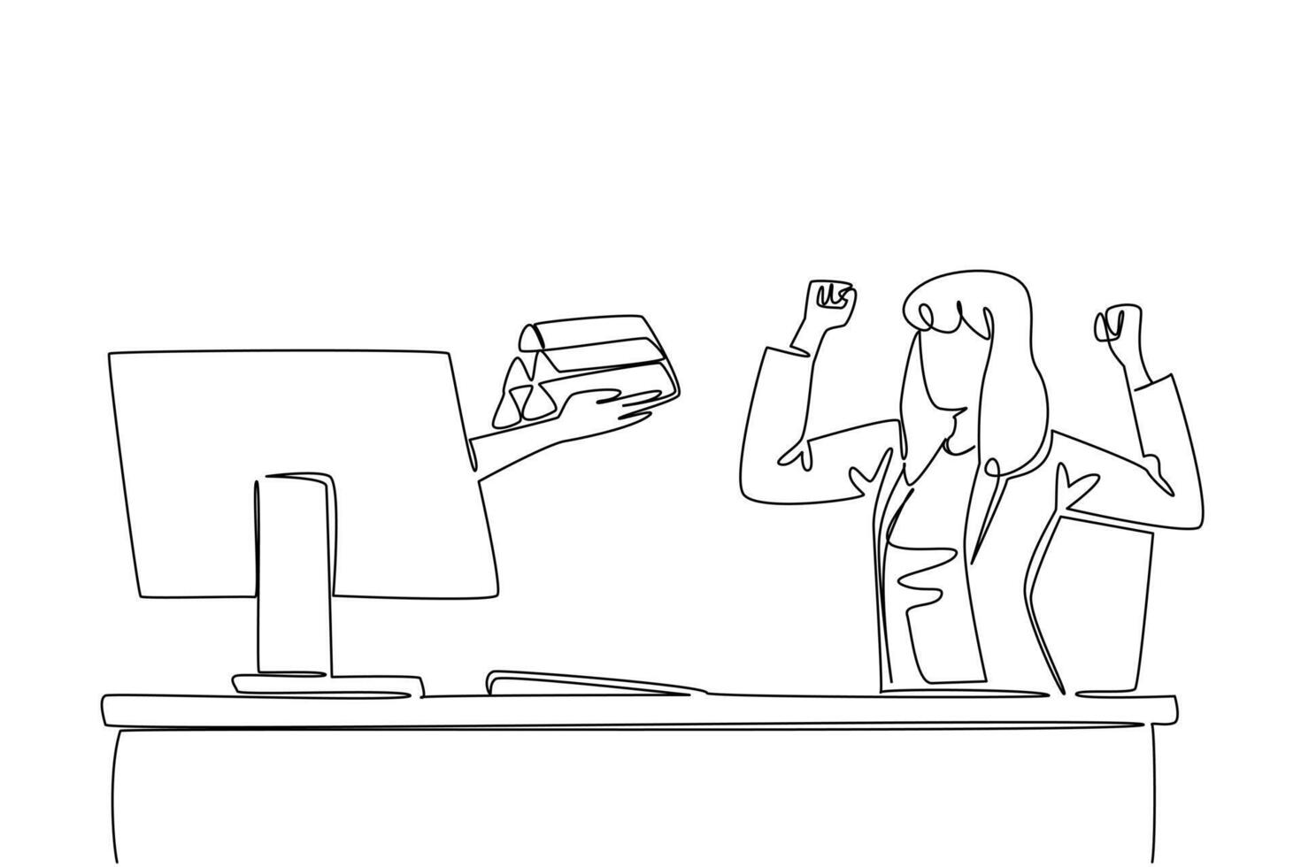 Single continuous line drawing hands out of the monitor screen while holding a gold stack. A token of gratitude for devotion. Very profitable. Things from Screen. One line illustration Pro Vector