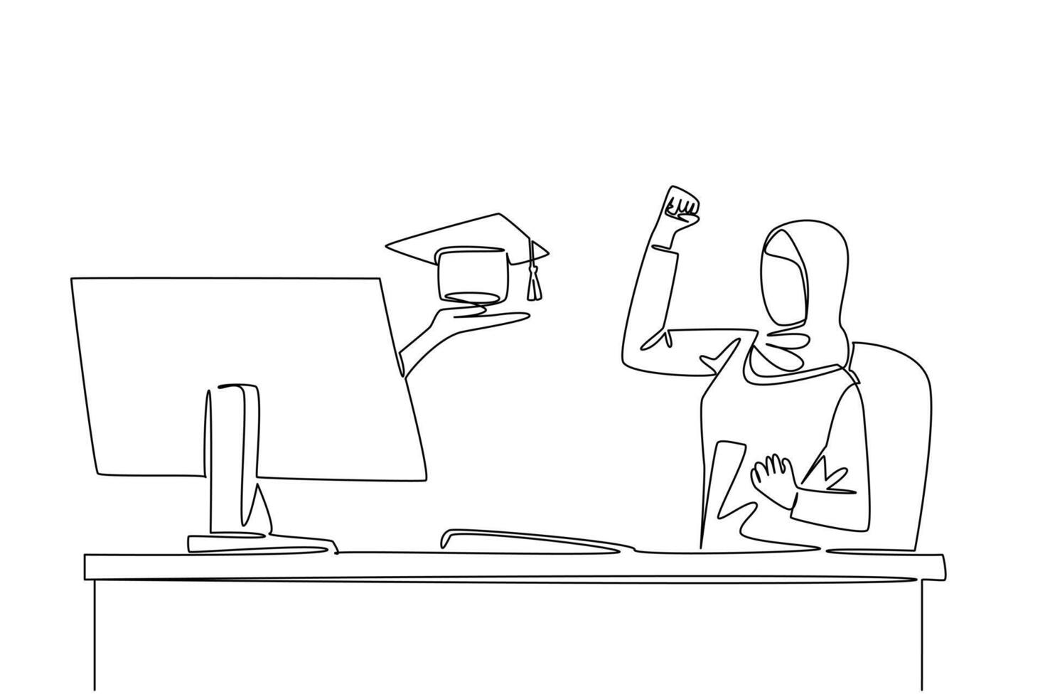 Single continuous line drawing hands out of the monitor screen while holding a graduation cap. Online lectures and graduation. The smart worker. Things from Screen. One line illustration Pro Vector