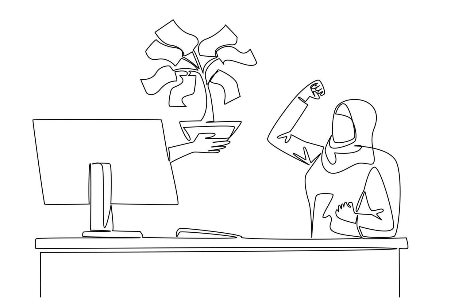 Single continuous line drawing hands out of the monitor screen while holding money tree with leaves made of banknotes. Investment. Profit. Fun. Things from Screen. One line design Pro Vector
