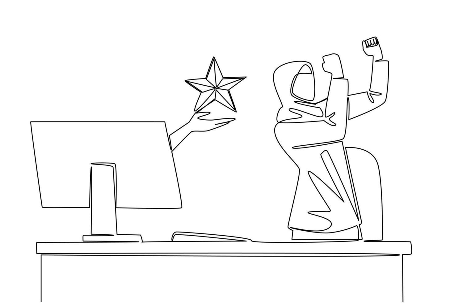Single one line drawing hands out of monitor screen while holding a star shape. Best rating is a good thing. The first step to success. Things from Screen. Continuous line design illustration Pro Vector