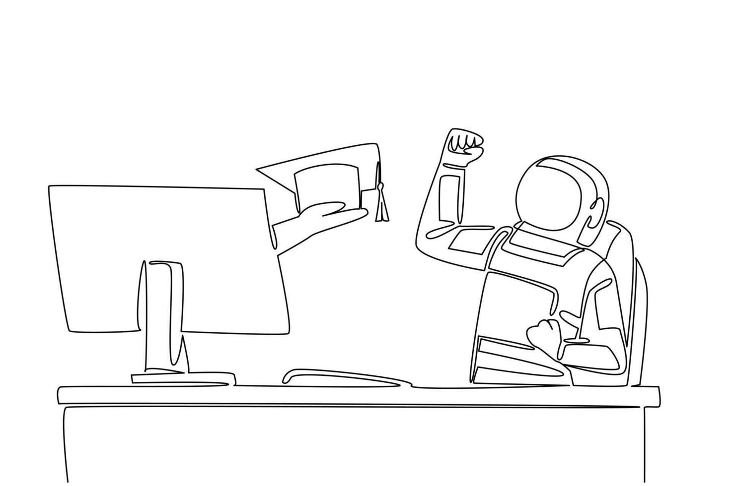 Single continuous line drawing hand of astronaut out of monitor screen while holding graduation cap. Smart astronaut. Science is the main thing. Things from Screen. One line design Pro Vector