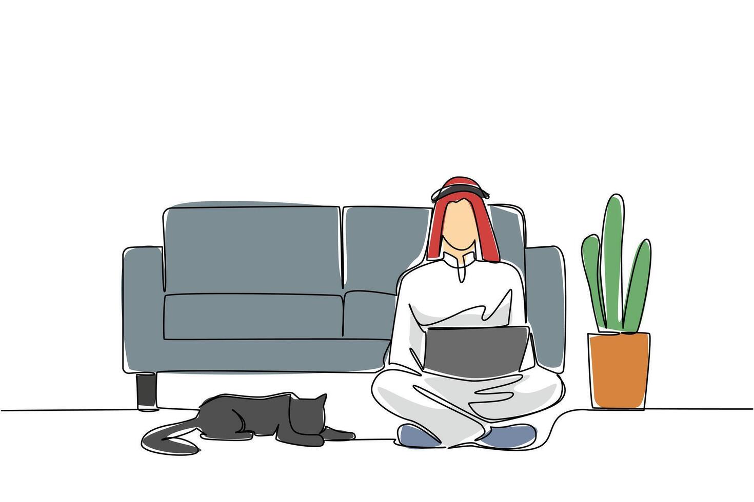 Continuous one line drawing arab man sits crosses legged on floor with laptop on lap and cat lying down. Creating application. National Work From Home Day. Single line draw design illustration Pro Vector