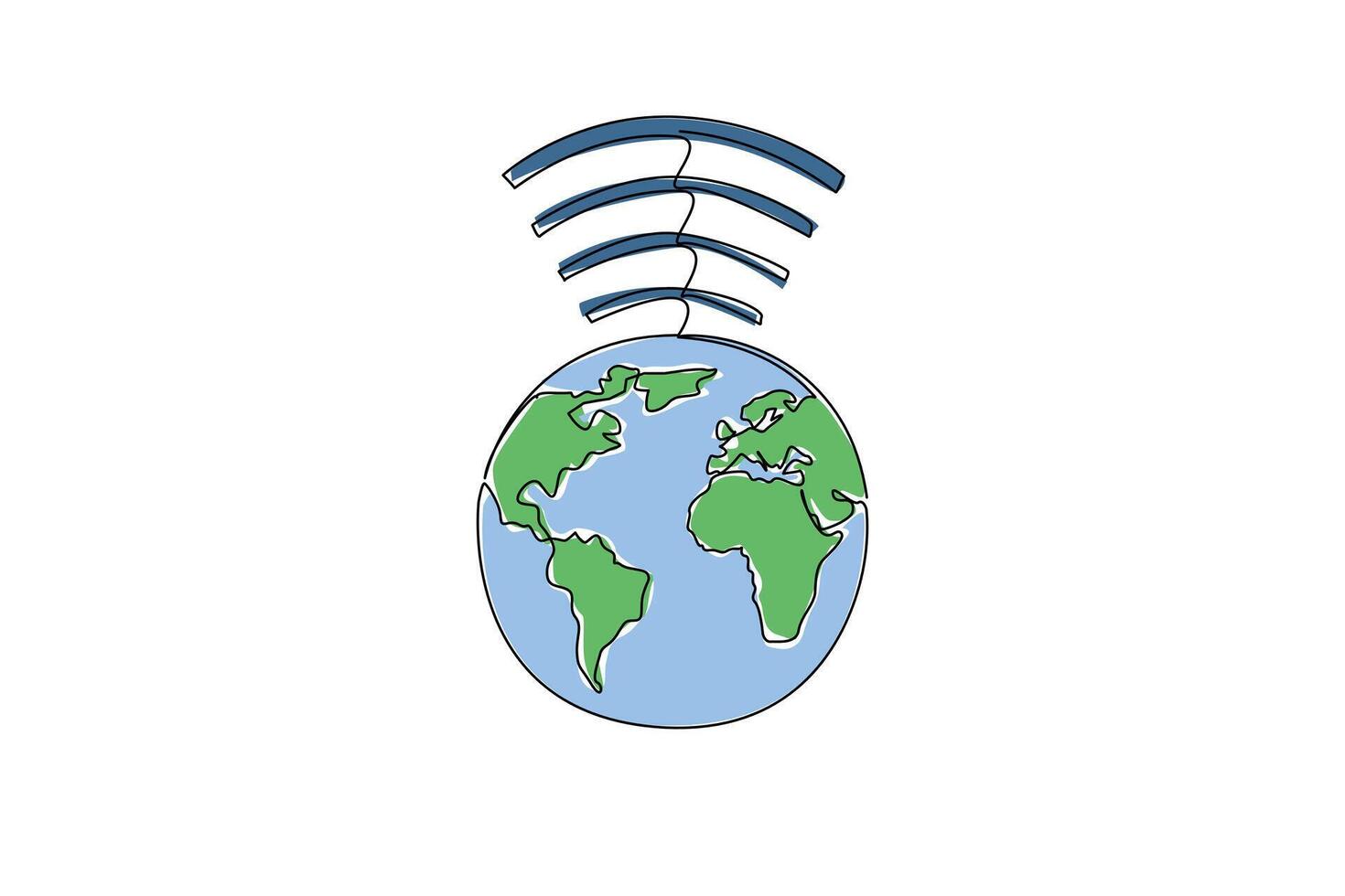 Continuous one line drawing full globe with wifi waves on top. Significant development of technology. World Telecommunication and Information Society Day. Single line draw design illustration Pro Vector