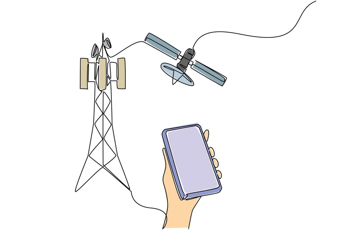Continuous one line drawing hand holds smartphone and pointing at transmitter tower. Progress of times. World Telecommunication and Information Society Day. Single line draw design illustration Pro Vector