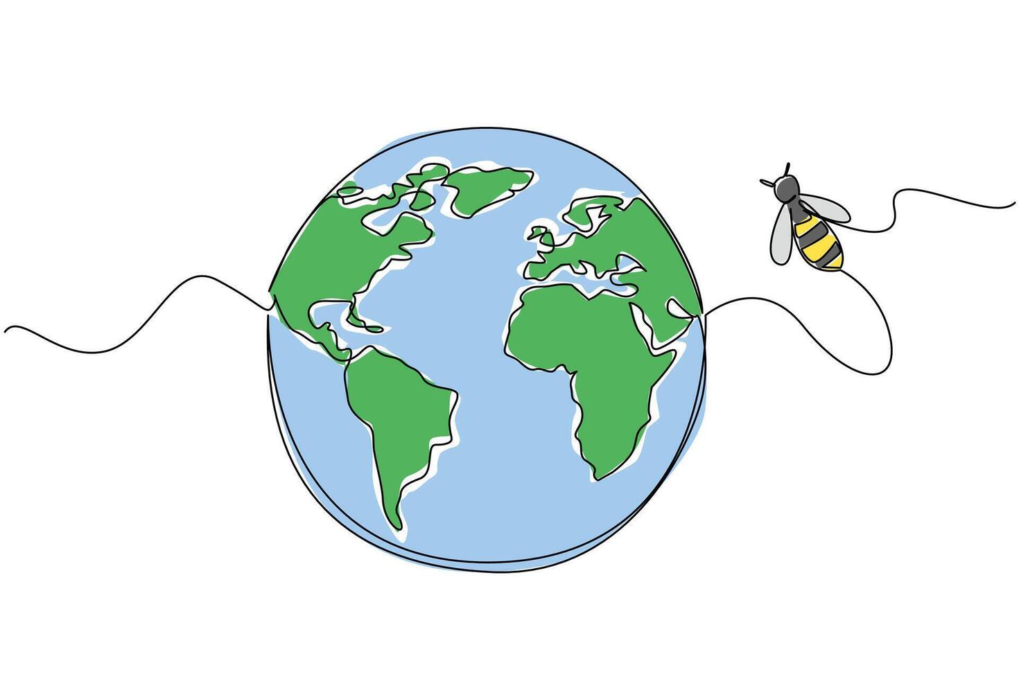 Single one line drawing a globe with bees flying around on the side. Bees migrate. Moving away from the decreasing best nesting grounds. World Bee Day. Continuous line design graphic illustration Pro Vector