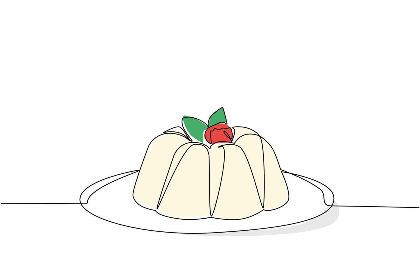 Single one line drawing vanilla pudding with raspberries topping on a plate. Complementary snacks after lunch. Delicious. National Vanilla Pudding Day. Continuous line design graphic illustration Pro Vector