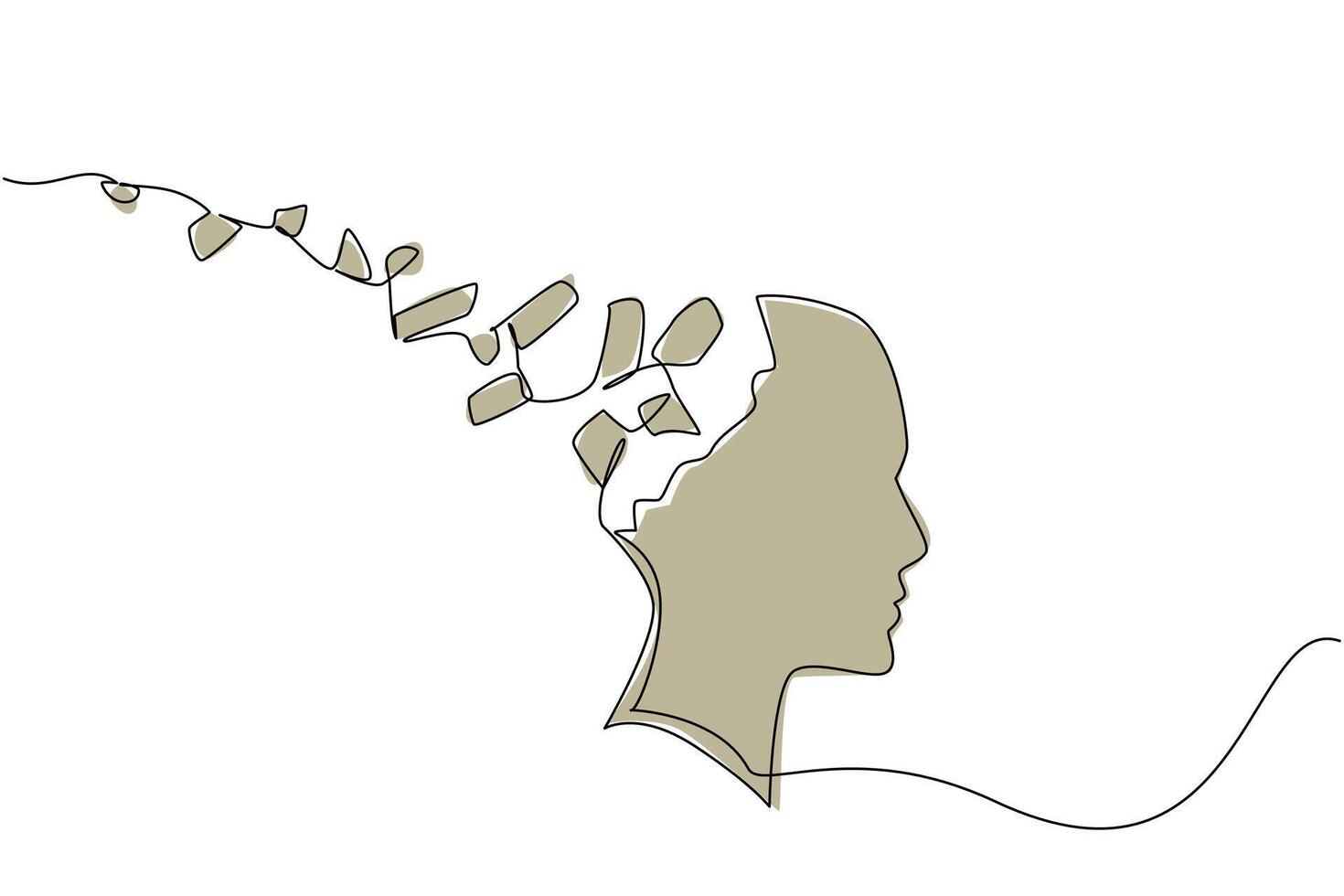 Continuous one line drawing silhouette of head with the back ripped off and turned into paper shreds. Difficulty thinking logically World Schizophrenia Day. Single line draw design illustration Pro Vector